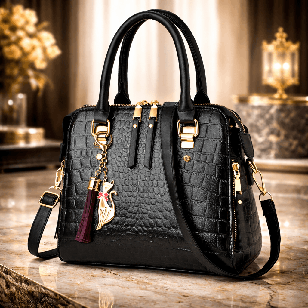 Ta czarna torebka damska to doskonałe połączenie elegancji i funkcjonalności. Idealnie sprawdzi się na co dzień, jak i podczas wyjątkowych okazji. Oryginalny wzór krokodyla oraz subtelny brelok sprawią, że poczujesz się wyjątkowo, gdziekolwiek ją zabierzesz.